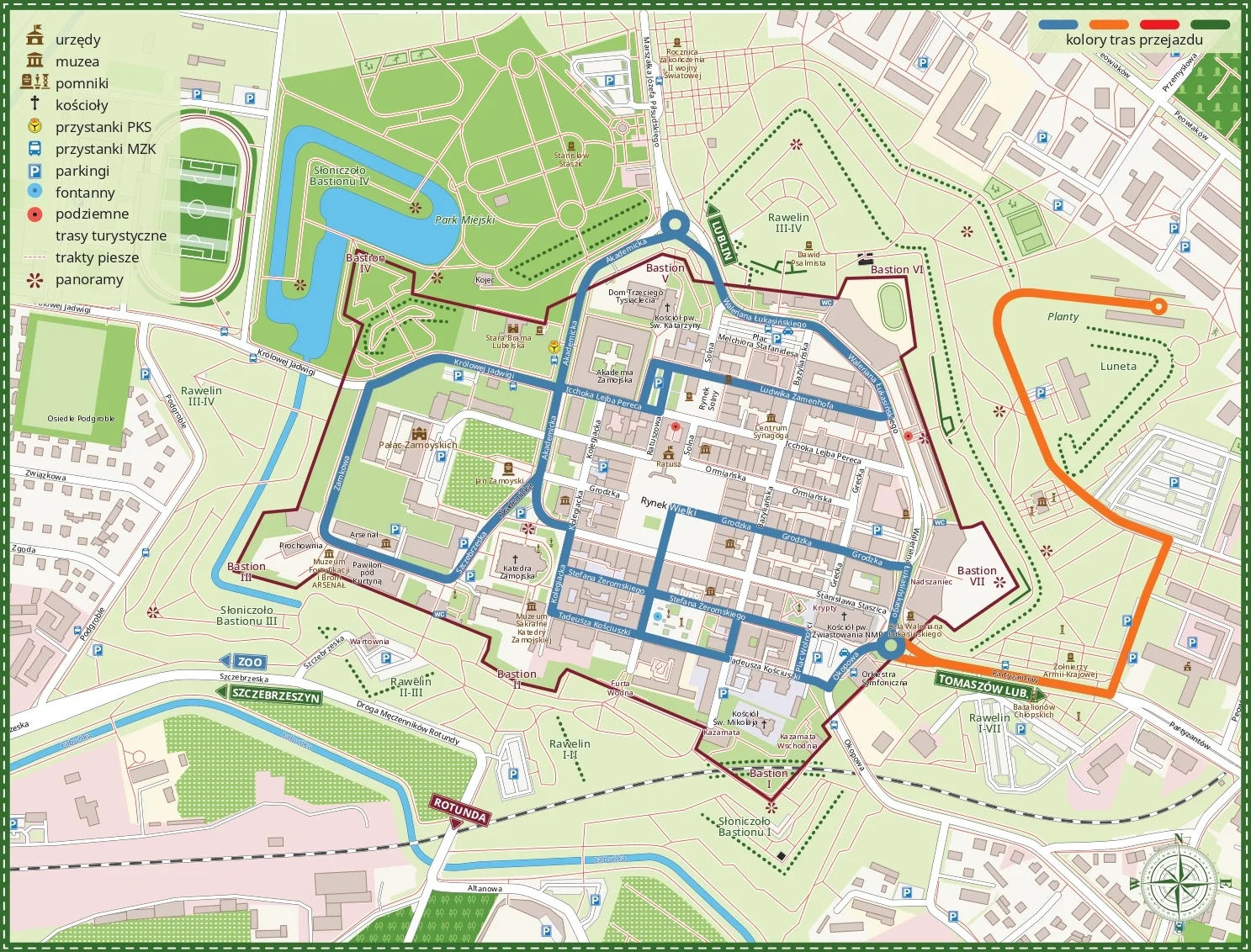 Odkryj Perłę Renensansu bez pośpiechu i wysiłku. Nasze zwiedzanie Zamościa meleksem to starannie zaplanowana wyprawa, która obejmuje wszystkie najważniejsze zabytki w obrębie murów obronnych Starego Miasta (trasa niebieska) oraz jest powiększone o wyjazd poza twierdzę od strony wschodniej (trasa pomarańczowa). Już na tej trasie wyjeżdżamy meleksem poza mury, aby pokazać Państwu potężne zamojskie fortyfikacje. Zamość to twierdza niezdobyta szturmem, dlatego warto zobaczyć mury, które powstrzymały m.in. Szwedów podczas Potopu. Od strony wschodniej mury są najbardziej okazałe, zrekonstruowane w latach 80. XX wieku.