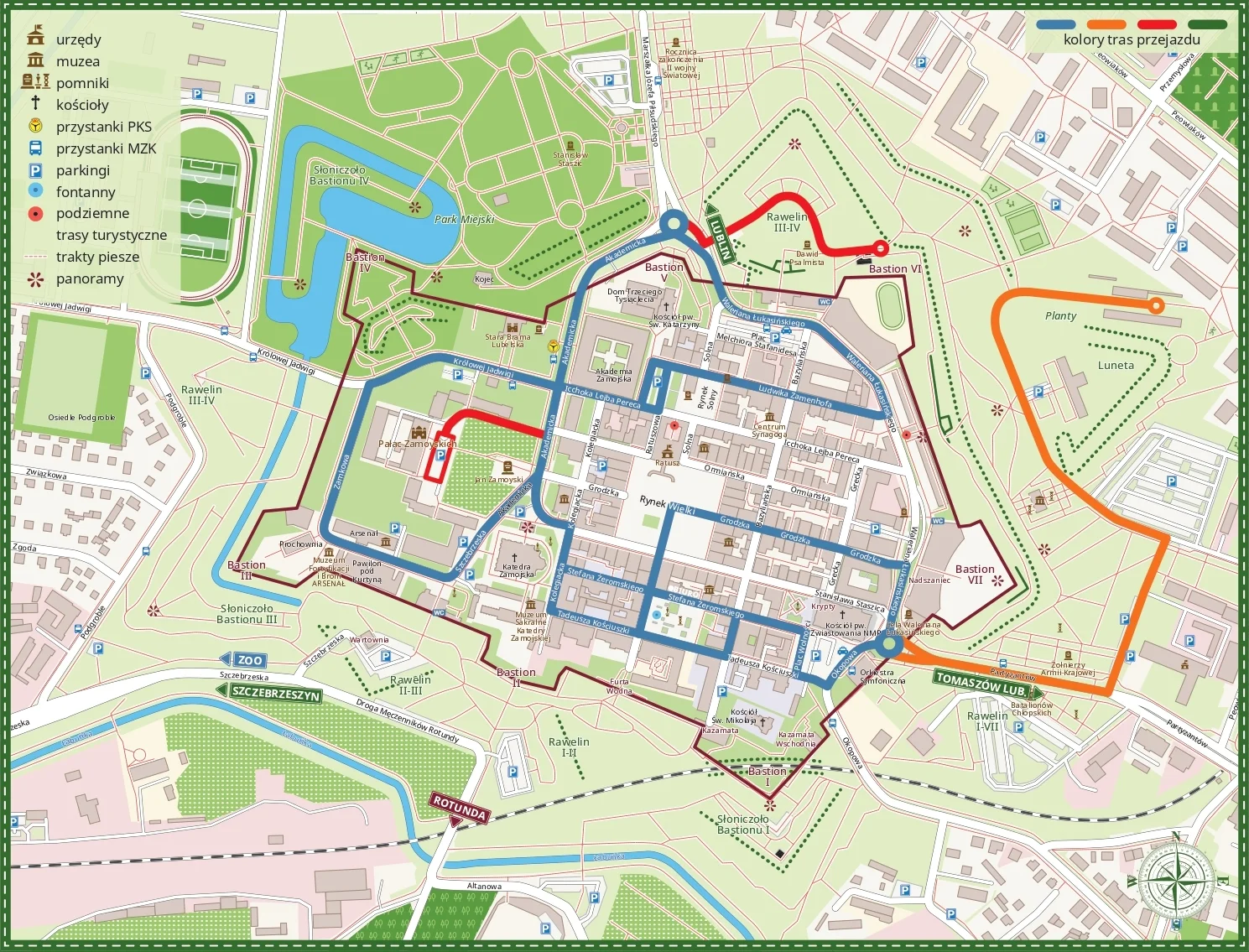 Odkryj Perłę Renensansu bez pośpiechu i wysiłku. Nasze zwiedzanie Zamościa meleksem to starannie zaplanowana wyprawa, która obejmuje wszystkie najważniejsze zabytki w obrębie murów obronnych Starego Miasta (trasa niebieska) oraz jest powiększone o wyjazd poza twierdzę od strony wschodniej (trasa pomarańczowa), jak również o mury obronne od strony północnej (trasa czerwona). Podczas tej wyprawy wyjeżdżamy meleksem poza mury z dwóch stron, aby pokazać Państwu pełną potęgę zamojskich fortyfikacji.
